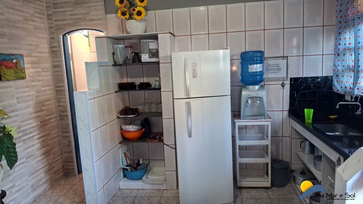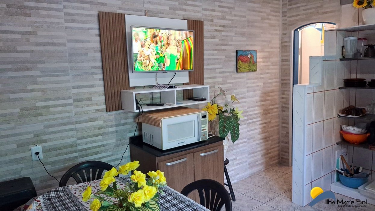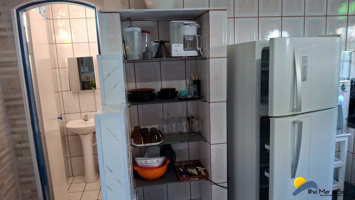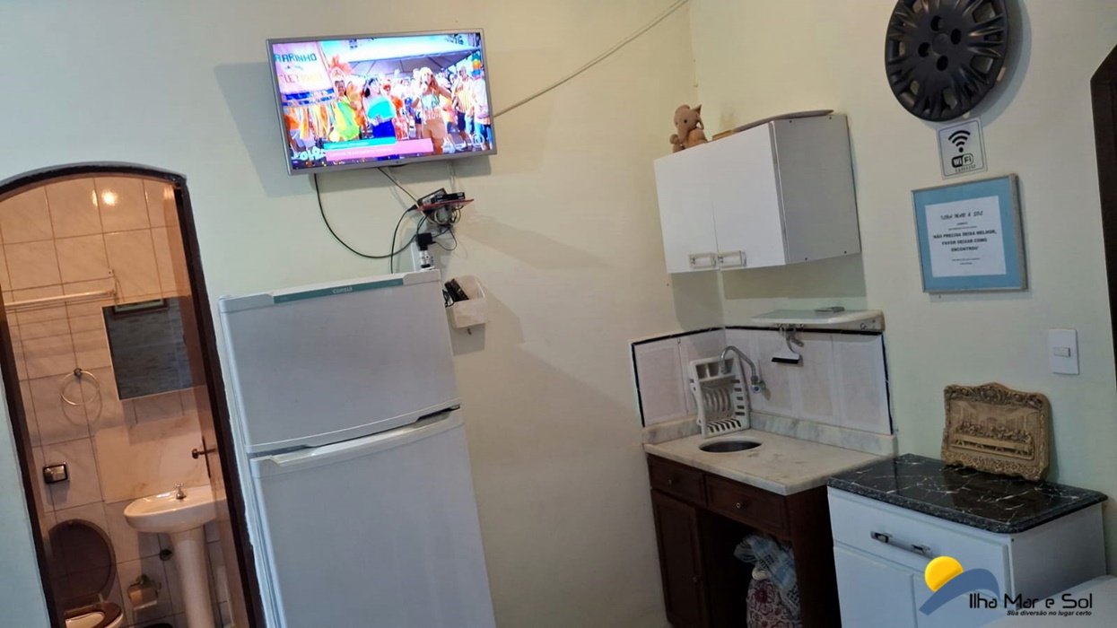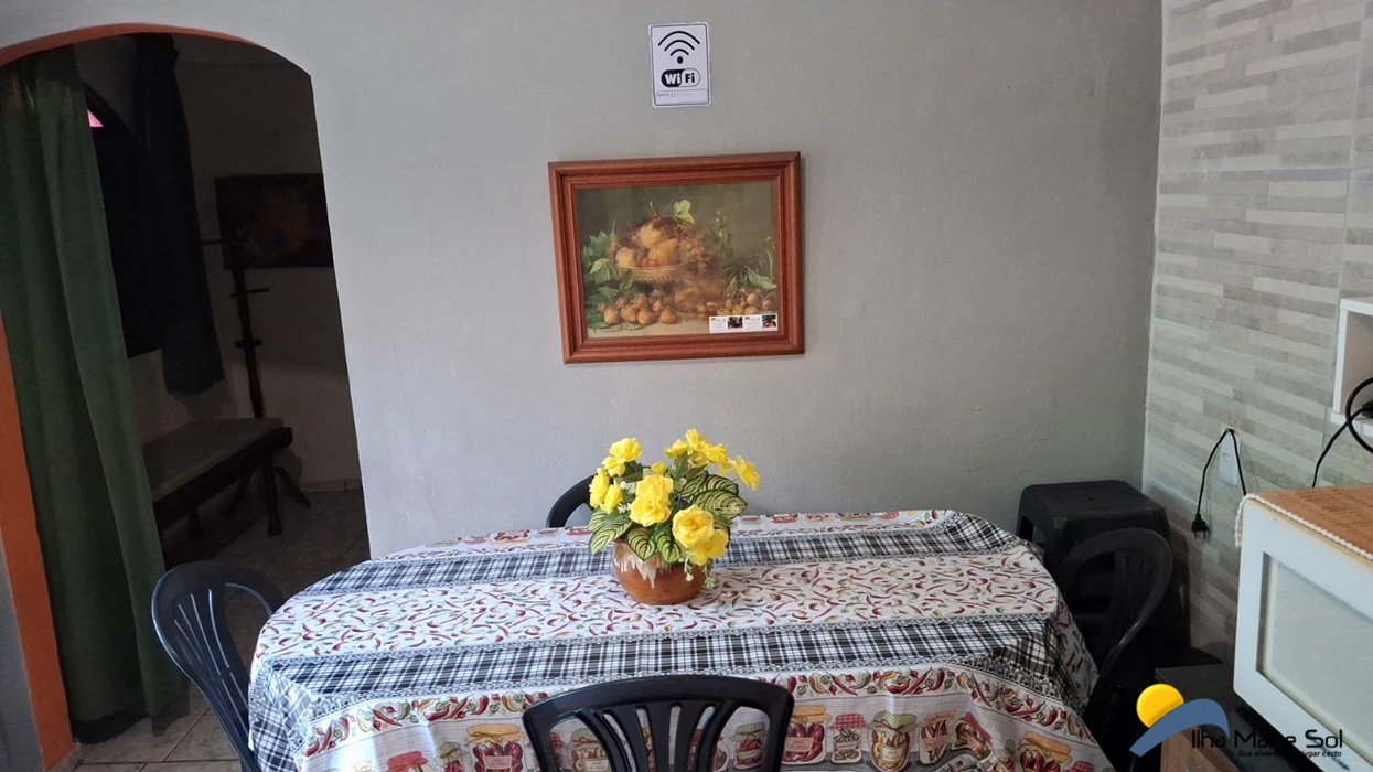 Utensílios e eletrodomésticos (serve perfeitamente 10 pessoas) Sala conjugada com a cozinha contendo uma TV c/parabólica digital e mesa de jantar.